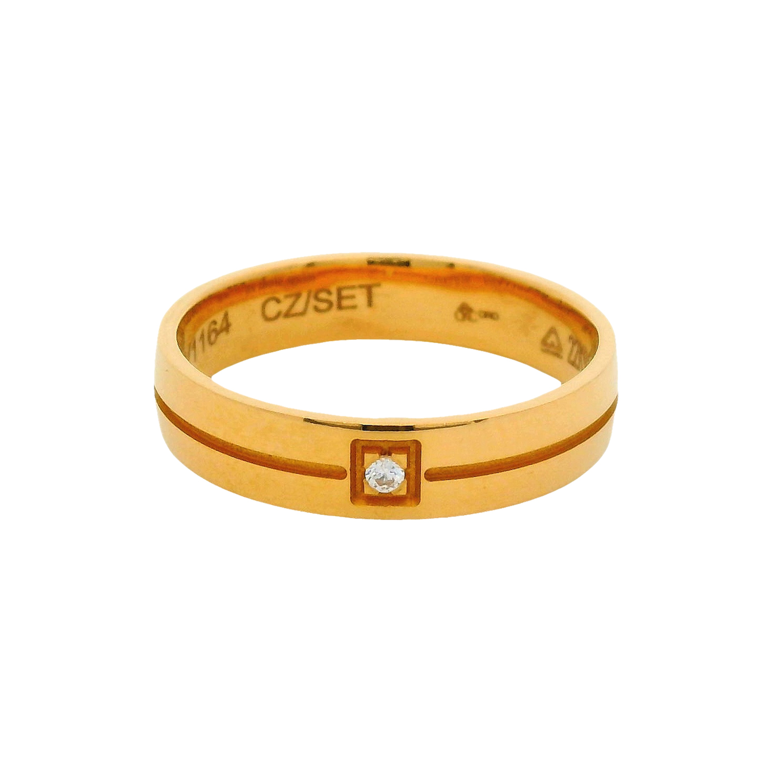 A sleek and sophisticated gold ring featuring a lustrous white cubic zirconia at its centre, highlighted by a dual-tone band in gold and white finish. Its clean, minimal design makes it perfect for everyday elegance or as a promise ring symbolising timeless love and brilliance.