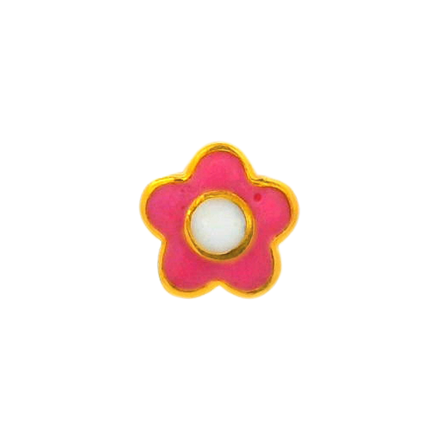 A delicate gold nose screw adorned with a radiant pink enamel flower, capturing the essence of grace, femininity and timeless floral beauty.
