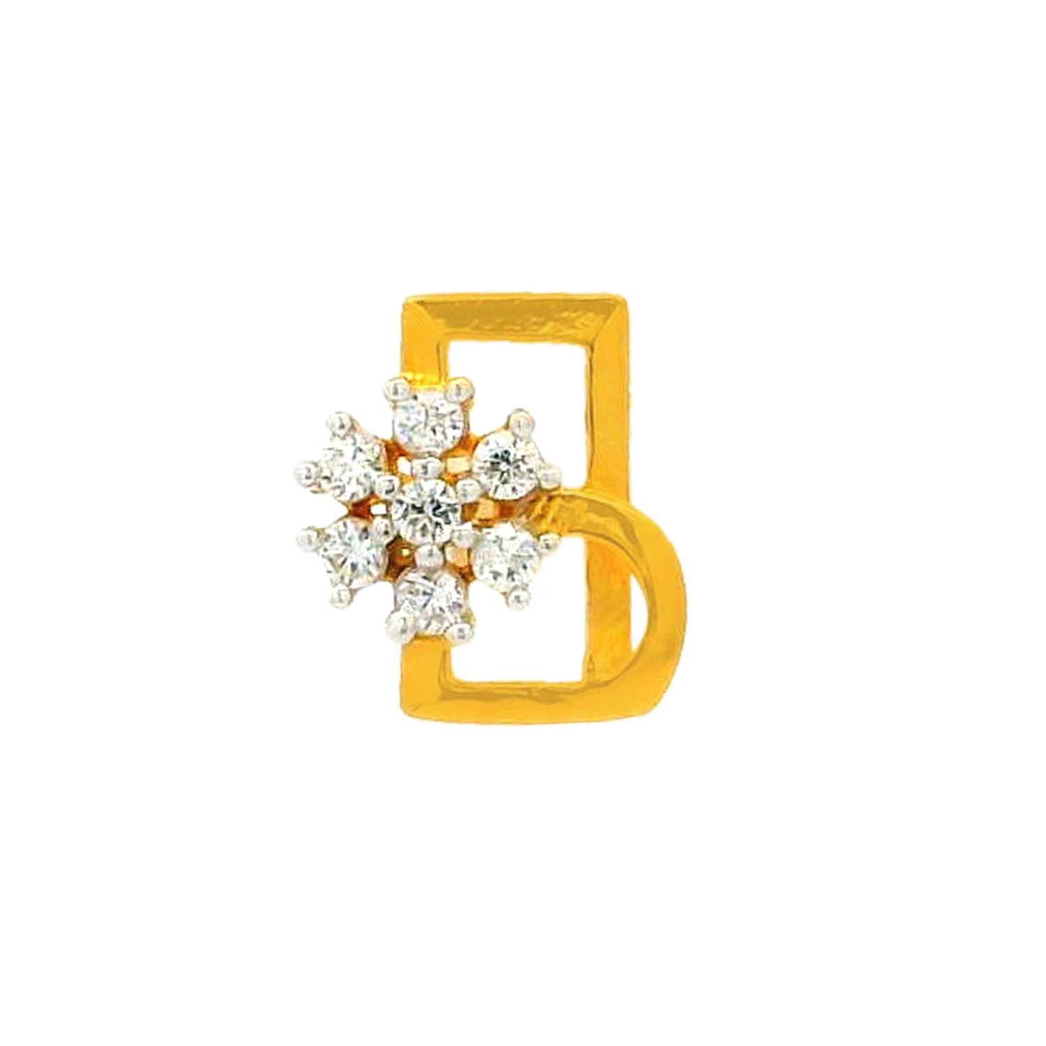 A chic gold nose screw featuring a triangular frame of vivid pink cubic zirconias surrounding a radiant imitation pearl, blending playful charm with refined elegance.