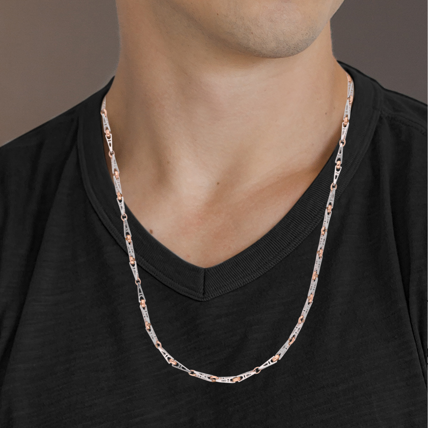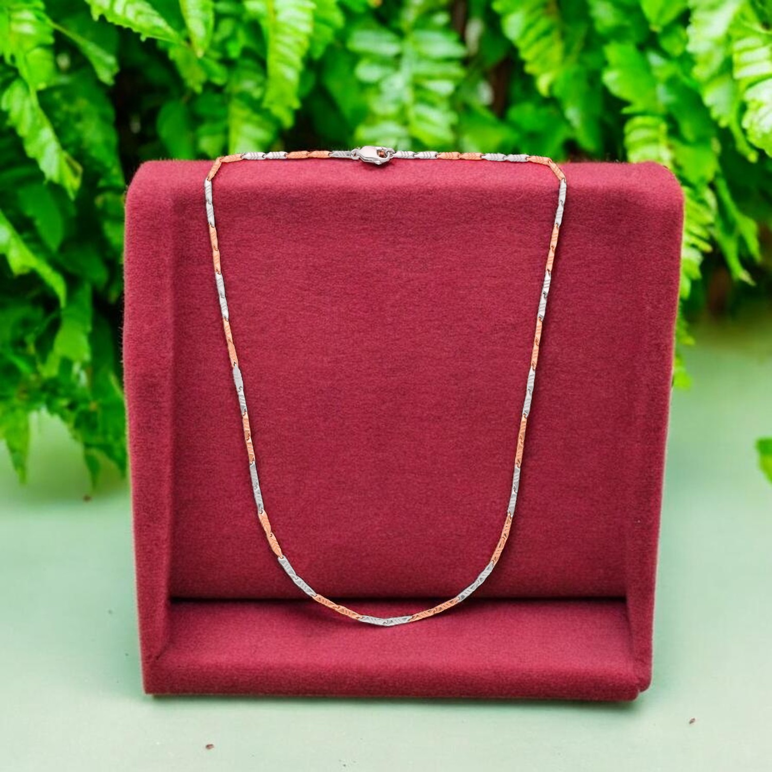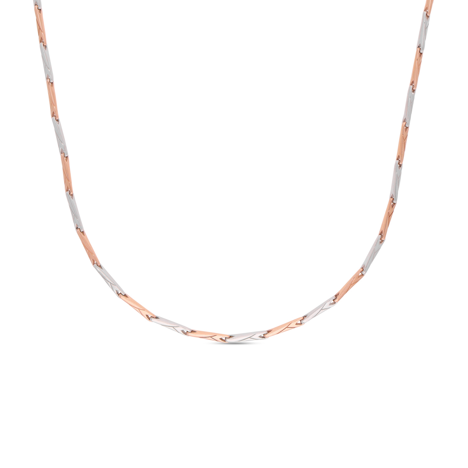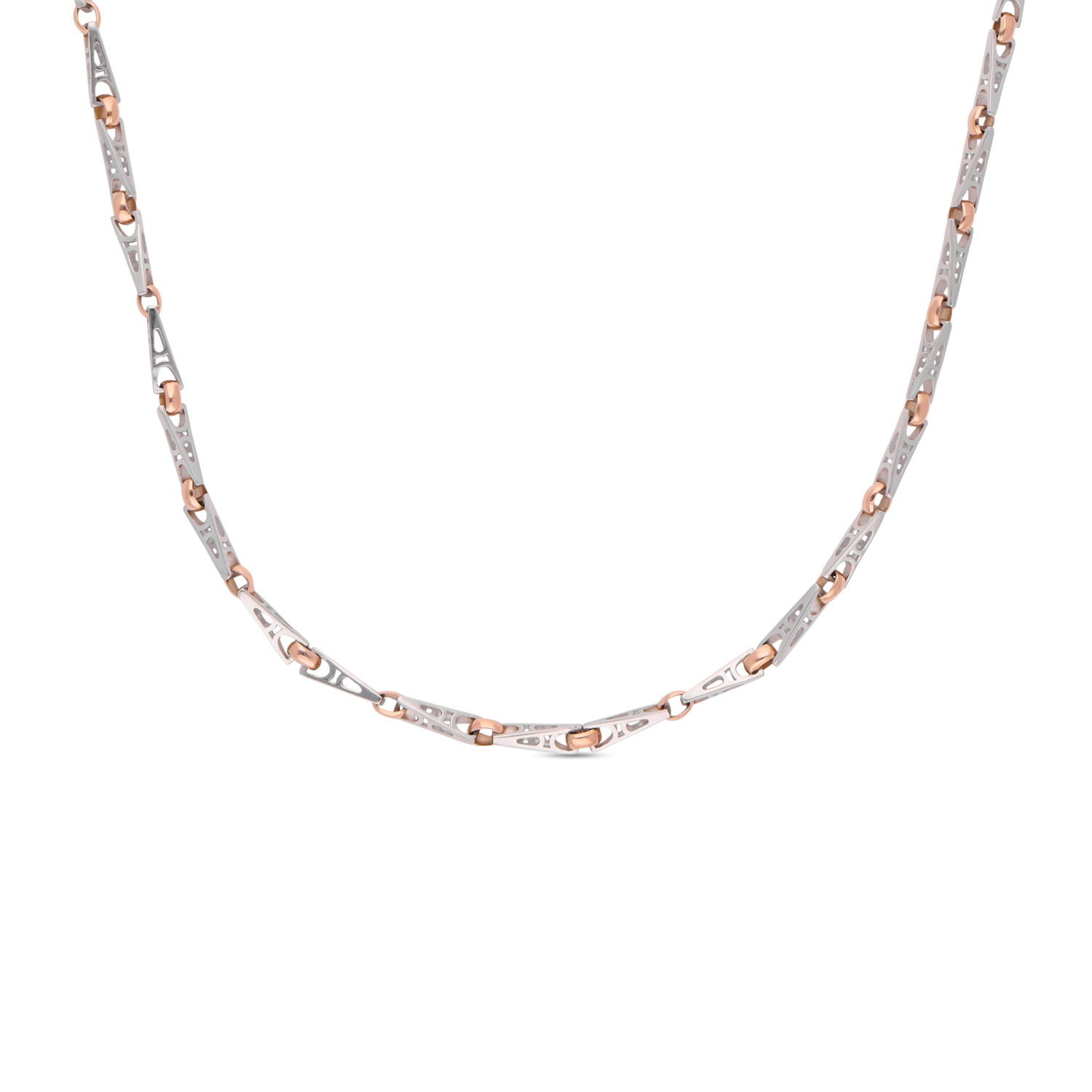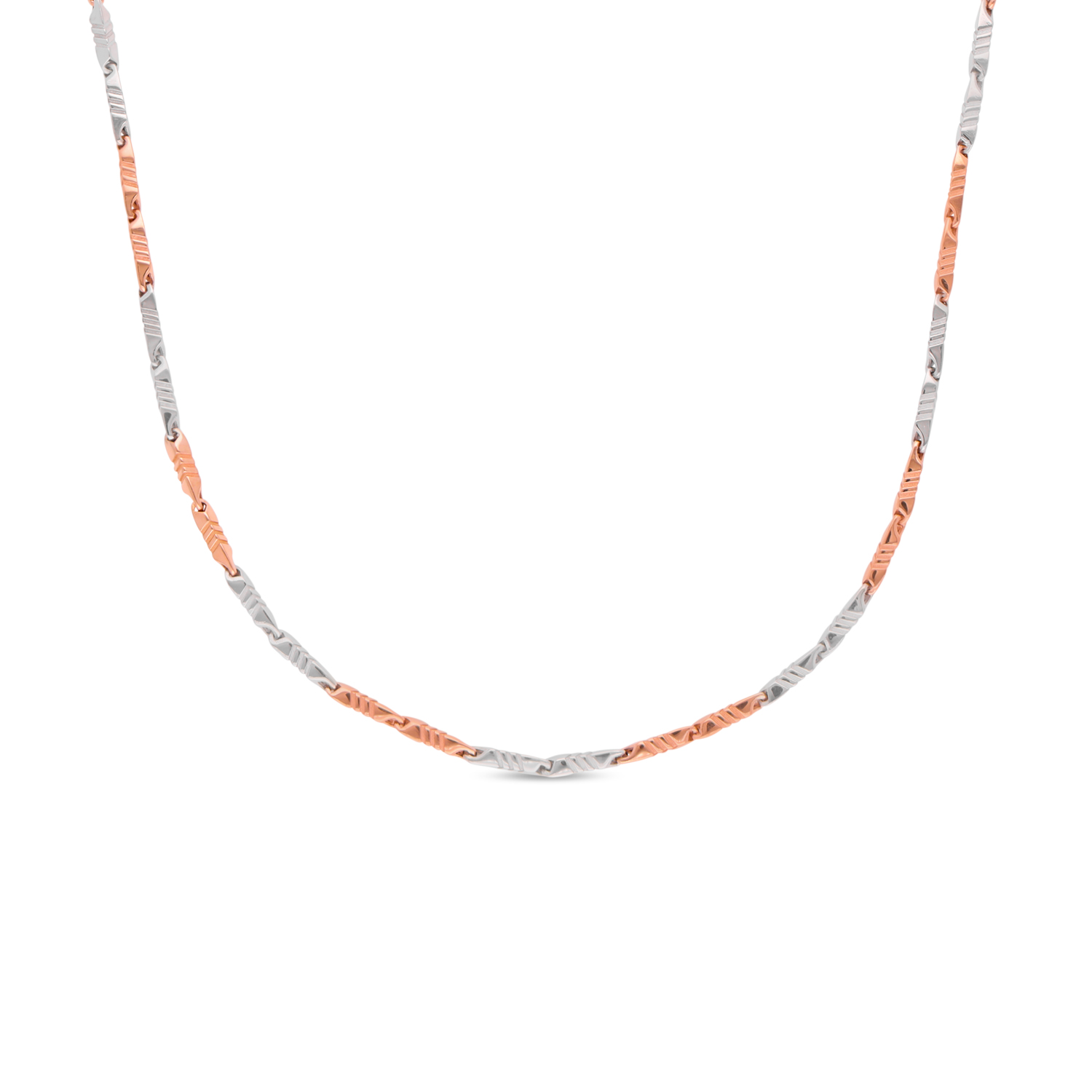A refined bi-metal chain crafted in luminous platinum accented with rose gold links. Minimal, contemporary and effortlessly luxurious, designed to elevate everyday elegance.