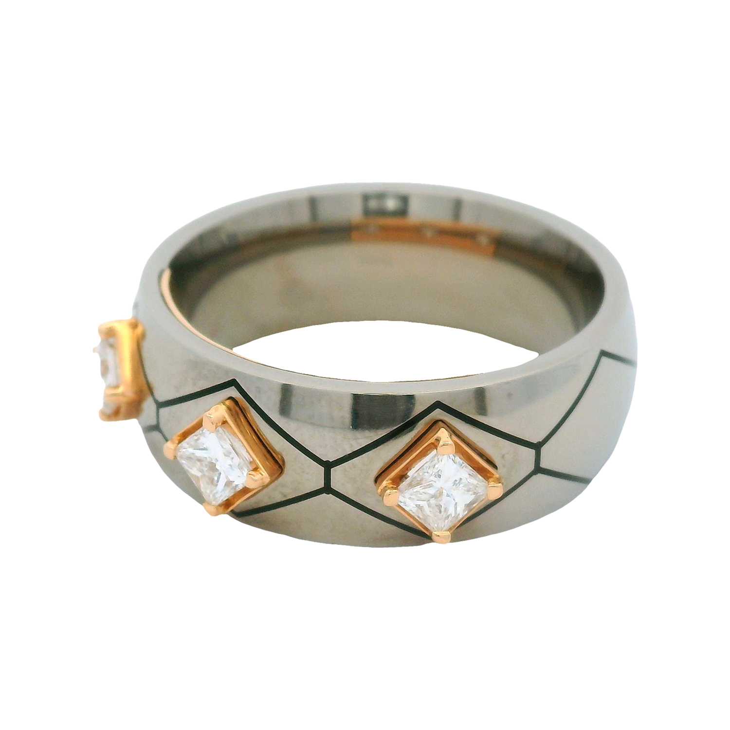 Crafted for the modern connoisseur, this striking gold and diamond ring features a sleek carbon fiber band, exuding strength and sophistication. The exquisite diamond embellishments add a touch of brilliance, making it a statement piece that seamlessly blends luxury with contemporary style.