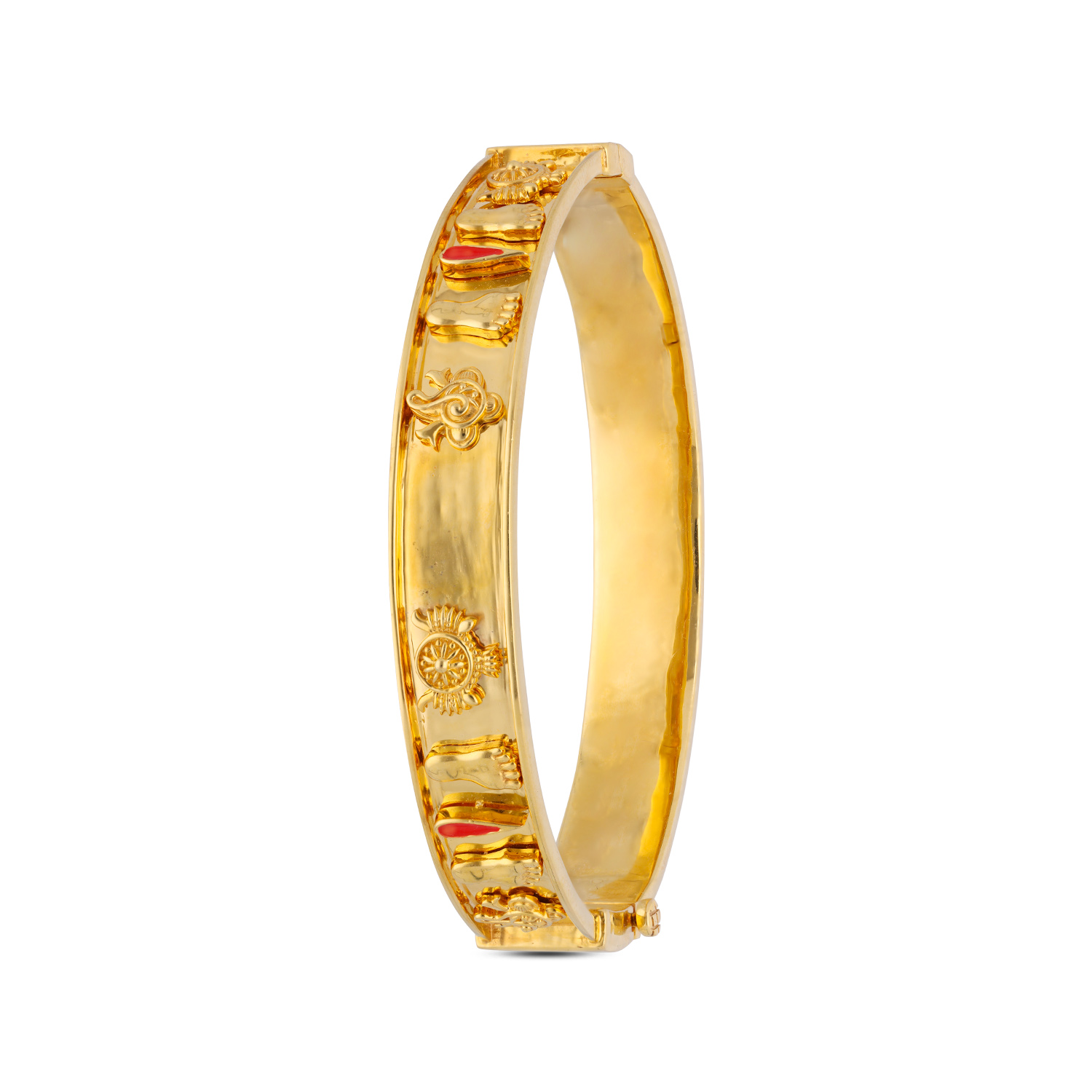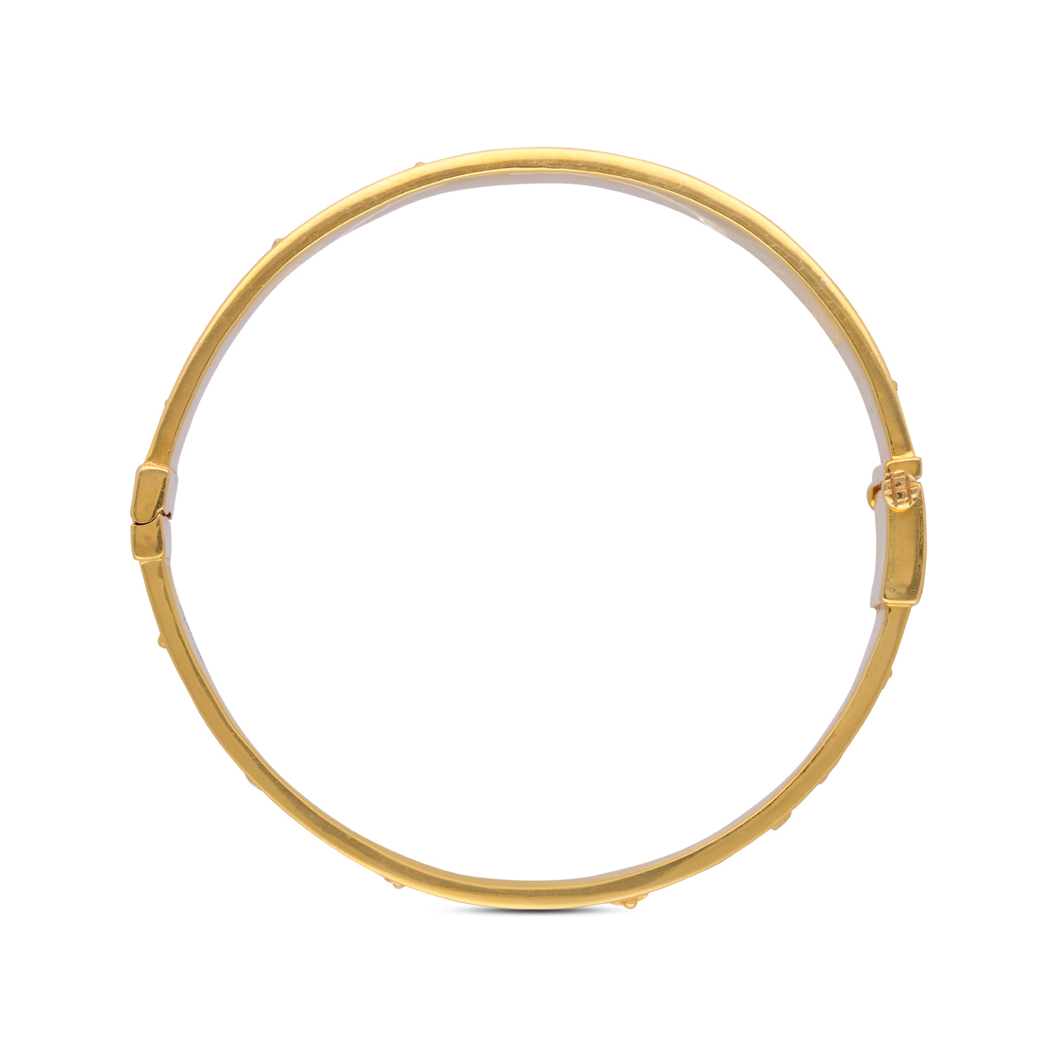 A celebration of regal artistry, this exquisite gold bangle is adorned with lustrous cultured pearls and radiant polki diamond motifs, creating a harmonious blend of tradition and timeless luxury. Its intricate detailing and graceful silhouette make it a standout piece for weddings, festive occasions, and heirloom-worthy elegance.