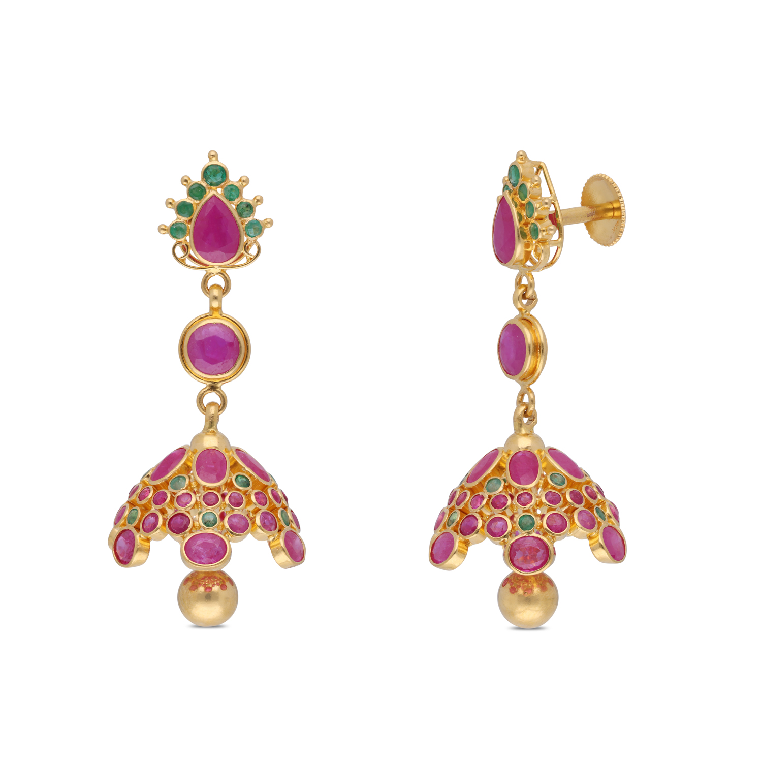 Celebrate timeless heritage with these artisanal gold jhumka ear drops, adorned with delicate rose cut diamonds, vivid rubies, and verdant emeralds. Each dome is accented with multicoloured meenakari work and finished with graceful strands of cultured pearls and emerald beads. A vibrant, festive statement crafted to echo the grandeur of traditional Indian craftsmanship.
