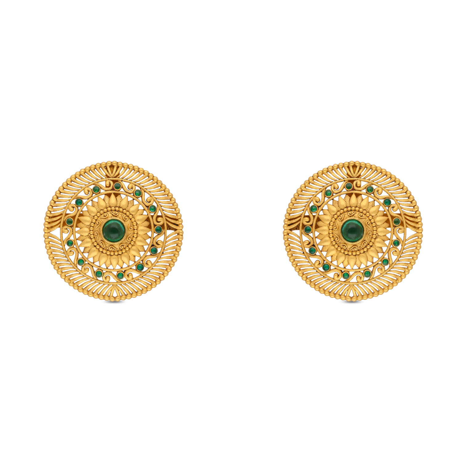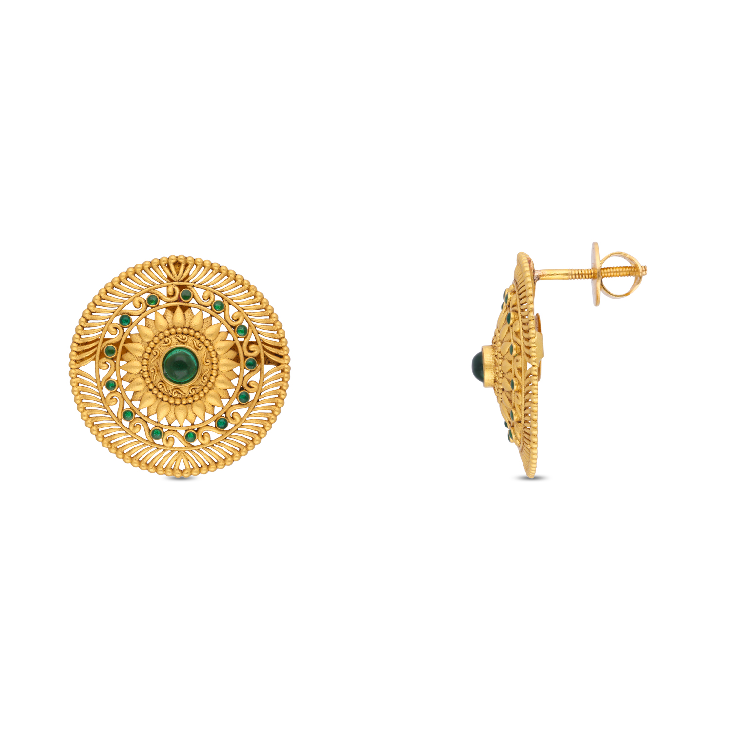 Inspired by traditional motifs, these gold ear studs feature intricate filigree work with a radiant green stone at the centre. A graceful nod to heritage with a timeless charm.