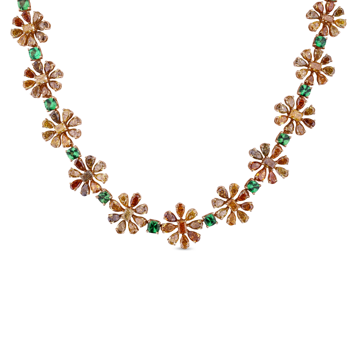Exuding timeless grace, this exquisite floral ring features a rare blush-pink Conch Pearl at its centre, radiating softness and rarity. A sparkling medley of brilliant-cut diamonds, vivid tsavorite garnets, and delicate pink sapphires blossoms around the centrepiece in a harmonious garden of light. A true collector’s piece, where heritage meets contemporary finesse.