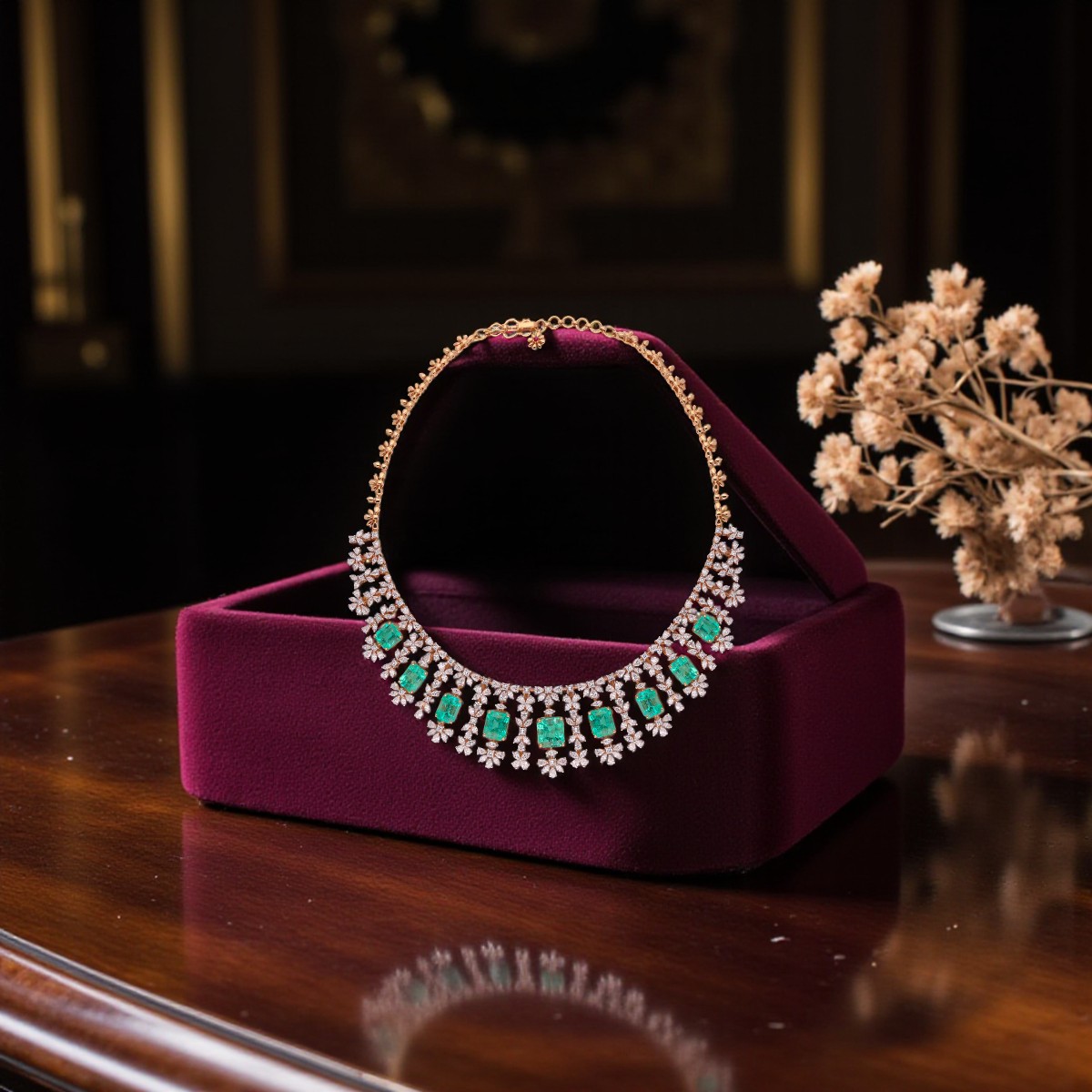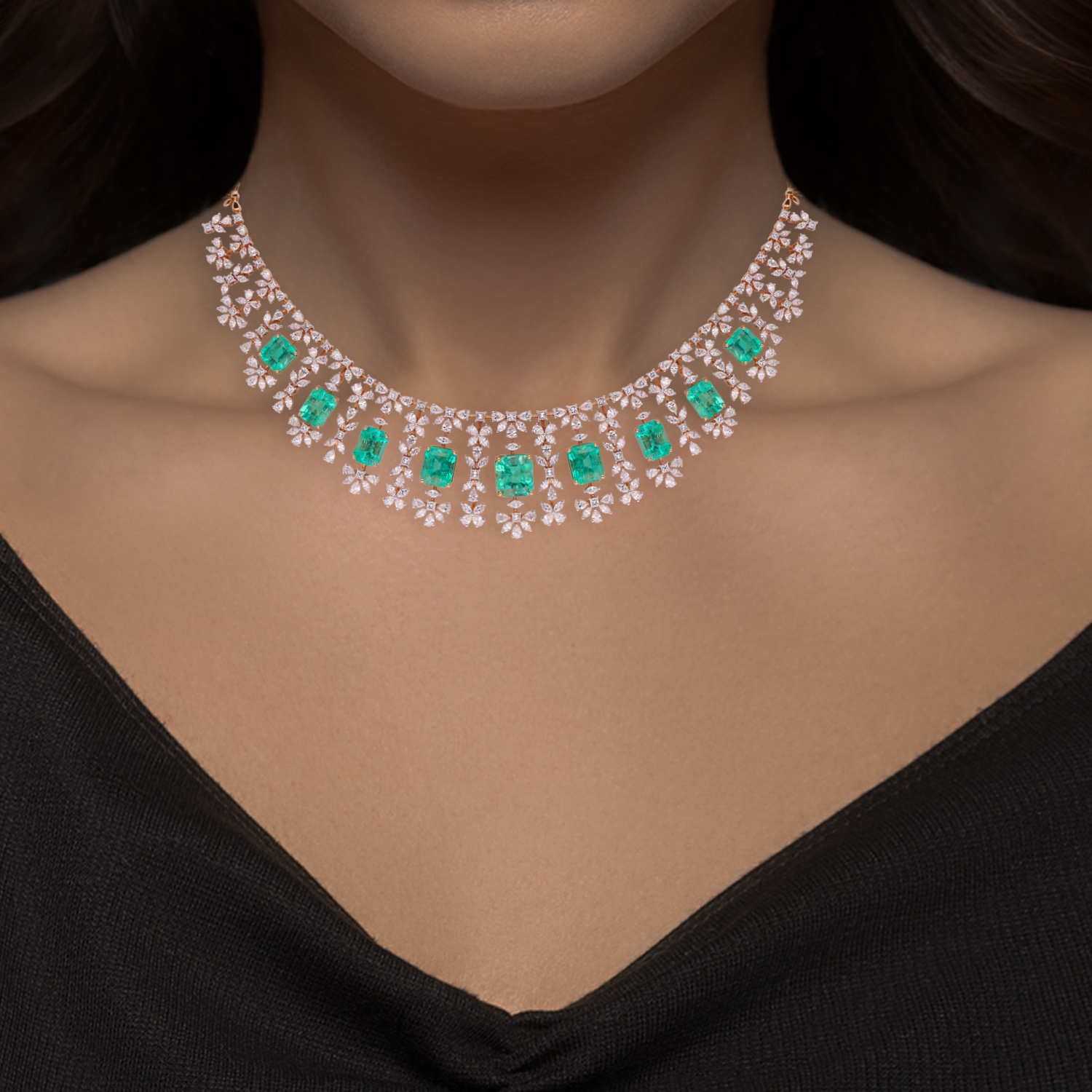 An extraordinary expression of grandeur, this diamond necklace is embellished with vivid emeralds and rich ruby accents, intricately arranged to create a regal symphony of brilliance, colour, and timeless elegance.