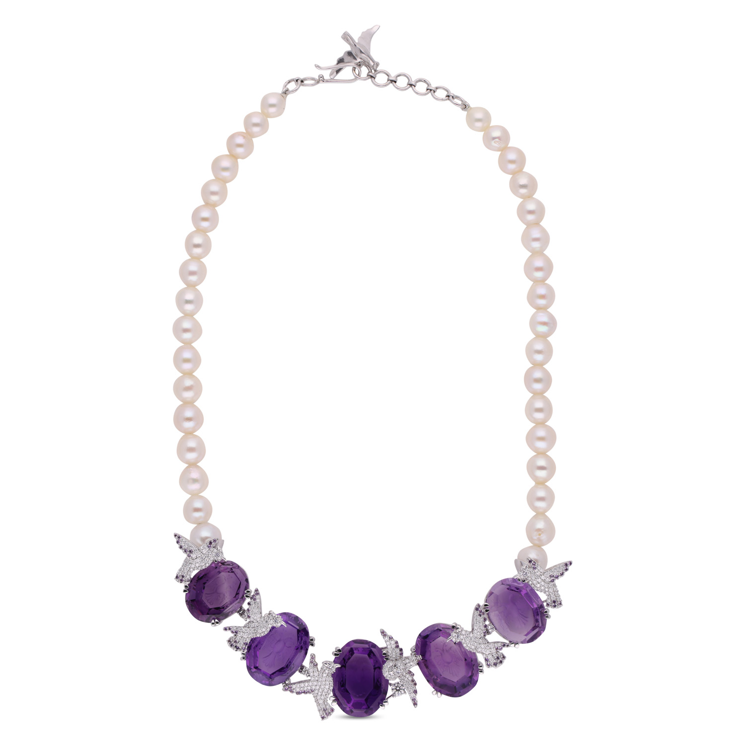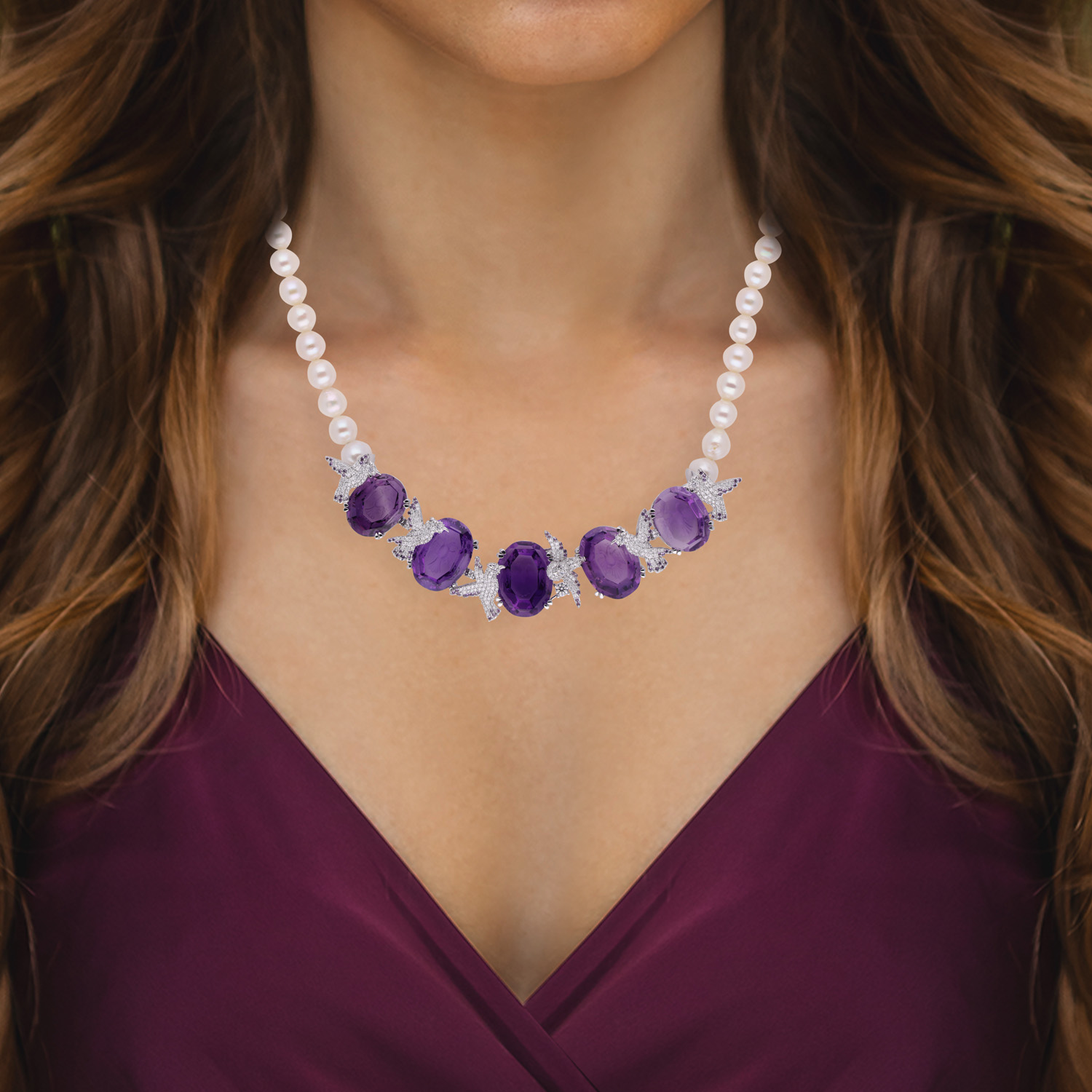 A refined pearl necklace adorned with luminous diamonds, rich amethyst and rare tanzanite, creating a graceful harmony of colour, brilliance and timeless elegance.