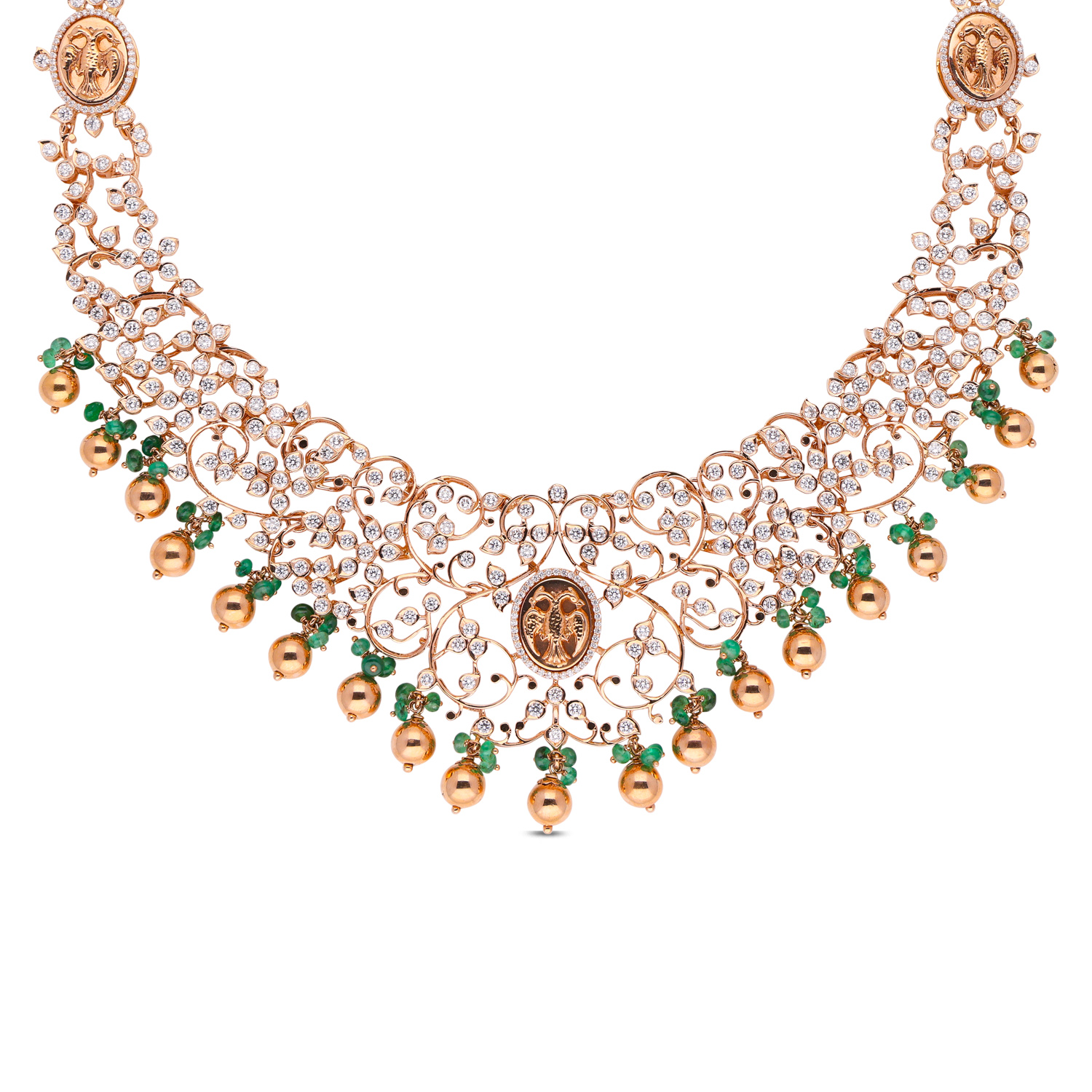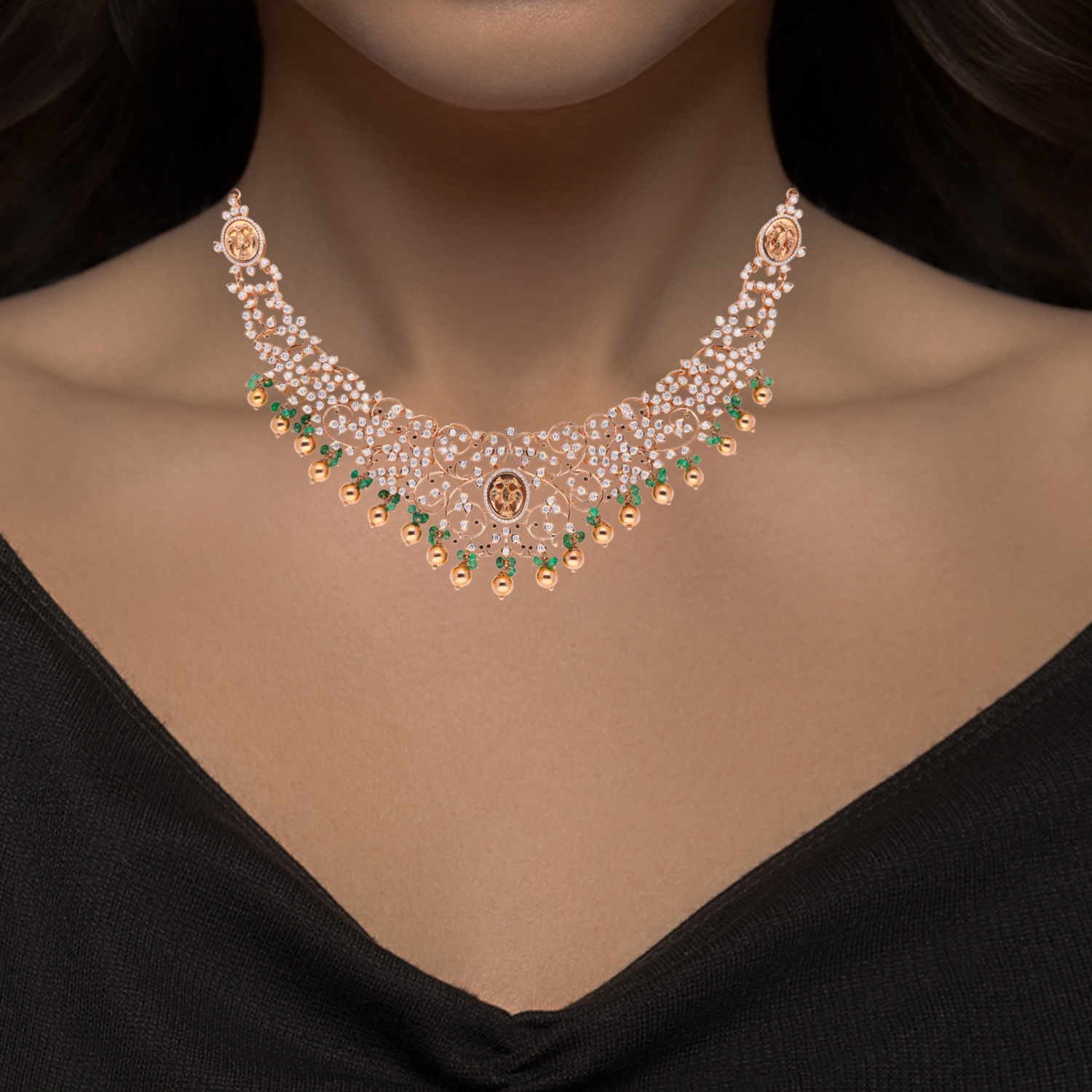 This exquisite necklace is a symphony of elegance and opulence, featuring a cascade of vibrant green emeralds leading down to a meticulously crafted pendant. The central pendant showcases a prominent emerald cut to perfection