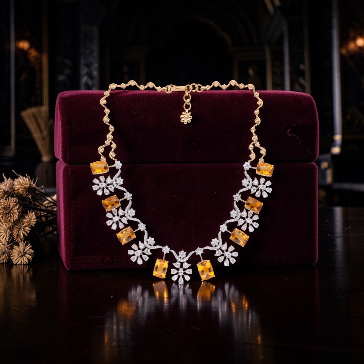 Radiating warmth and brilliance, this exquisite diamond necklace is adorned with vibrant citrine gemstones and delicately set diamonds, creating a harmonious blend of golden glow, refined sparkle, and timeless luxury.