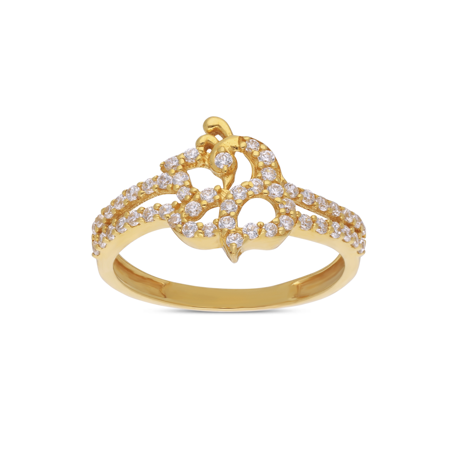 A delicate fusion of elegance and artistry, this gold ring is designed with a captivating floral-inspired motif, adorned with shimmering white cubic zirconia. Its graceful structure and intricate detailing exude timeless charm, making it a perfect symbol of refined sophistication.