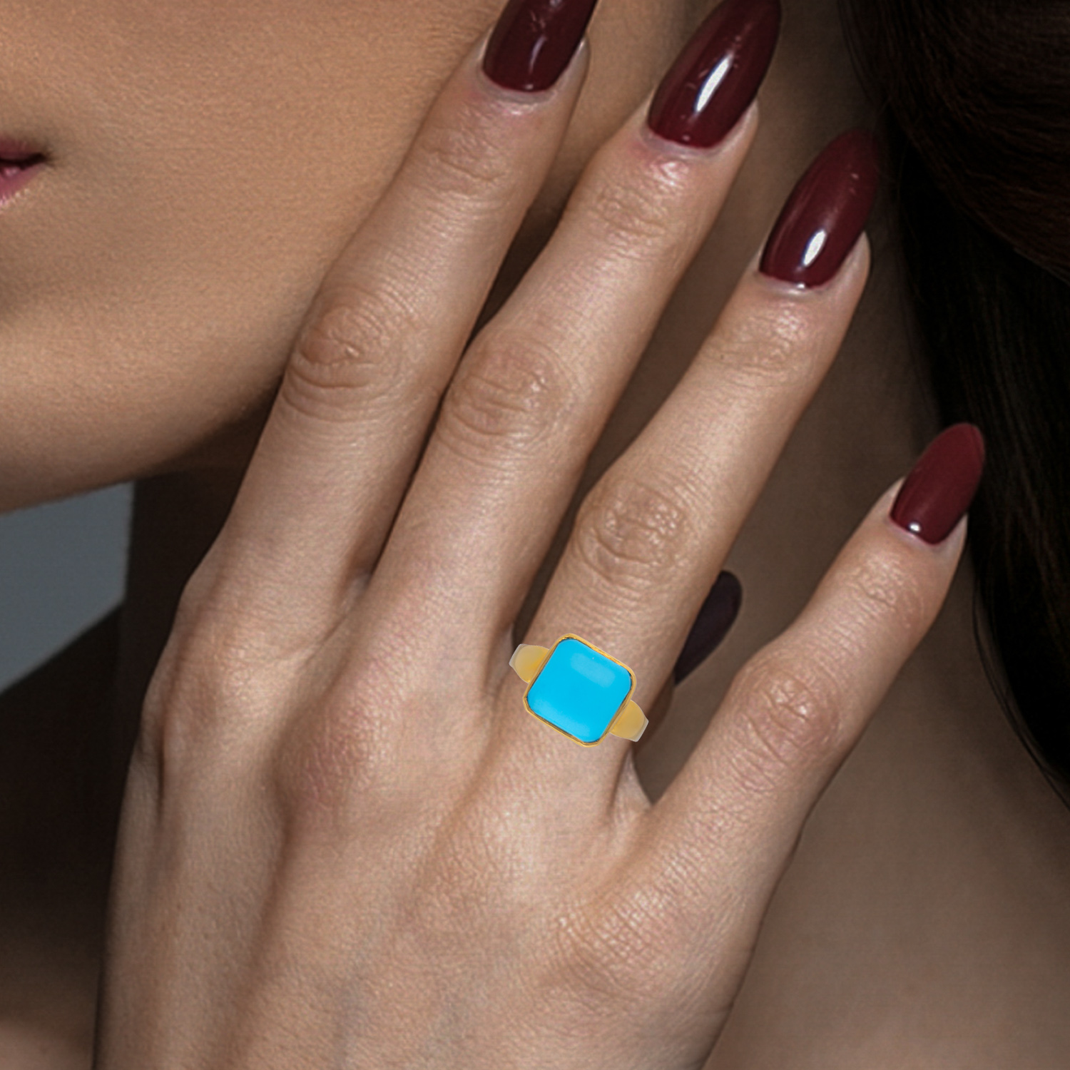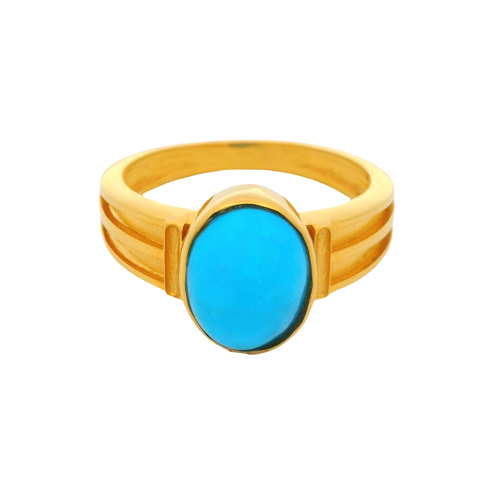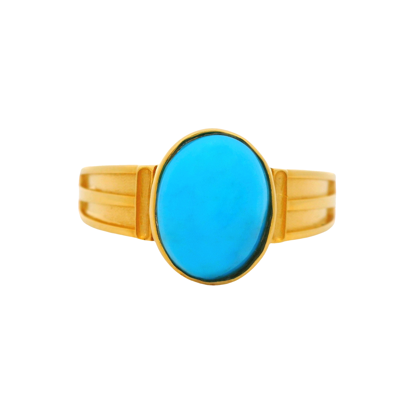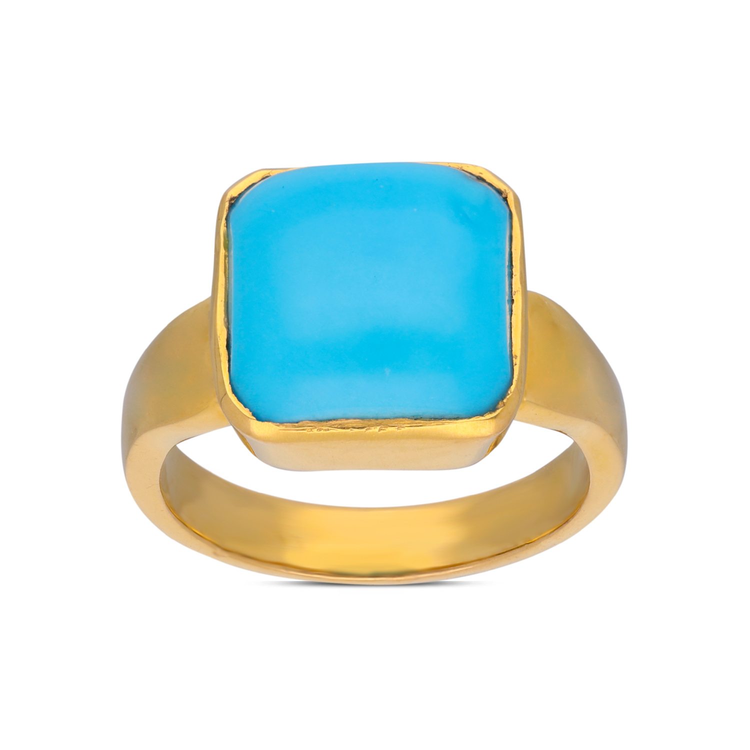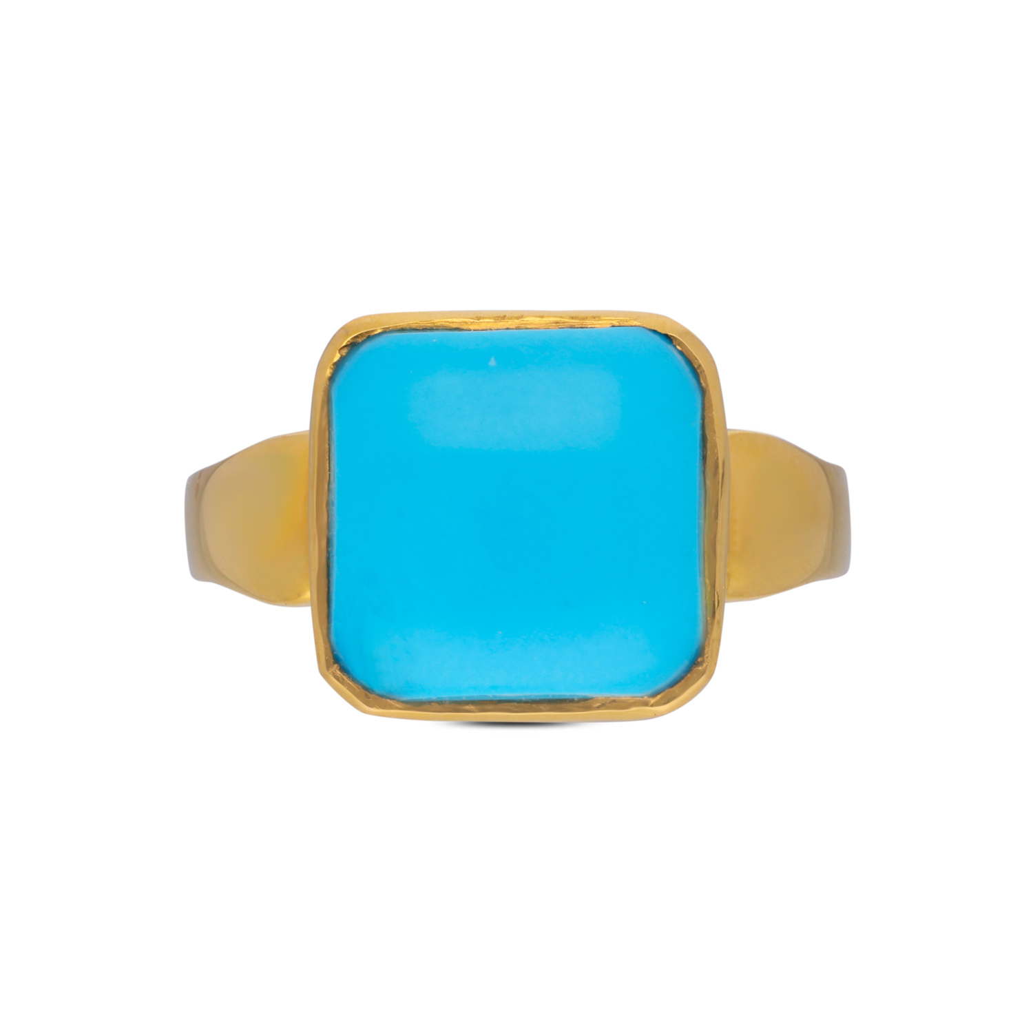 An exquisite Turquoise gemstone set in a sleek golden band. This ring captures elegance and sophistication with its vibrant blue hue, making it a statement piece for any occasion.