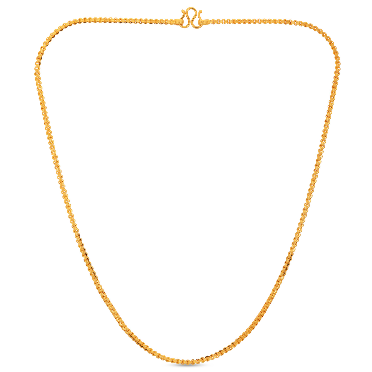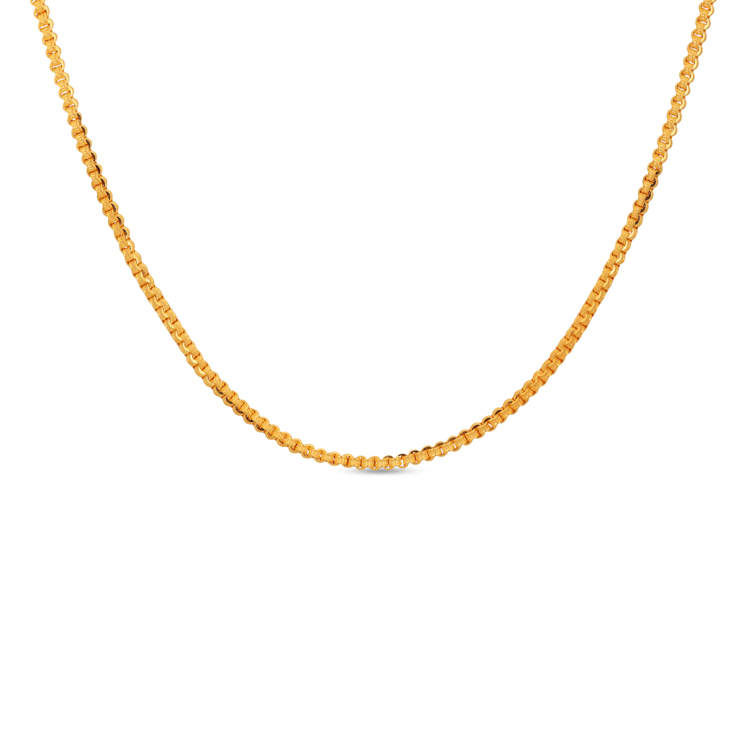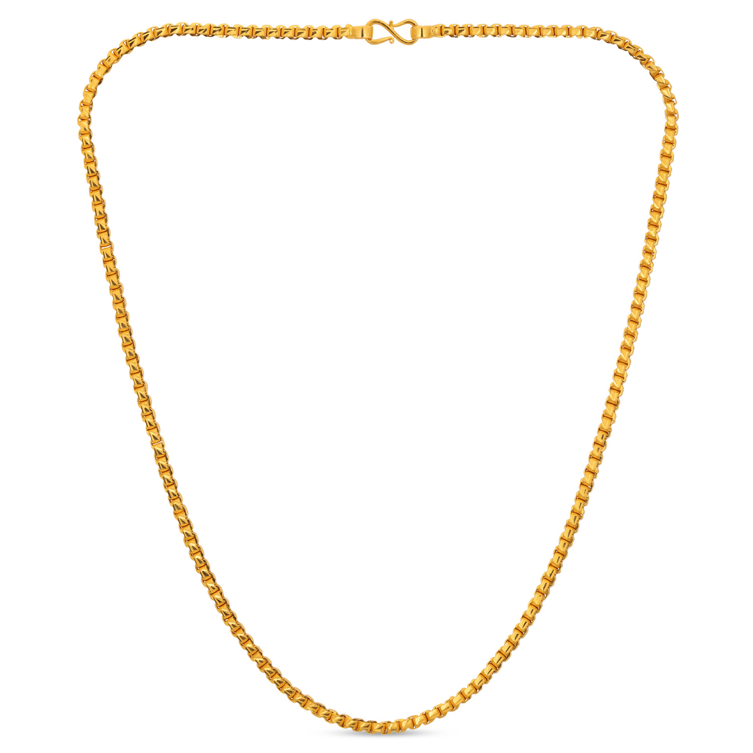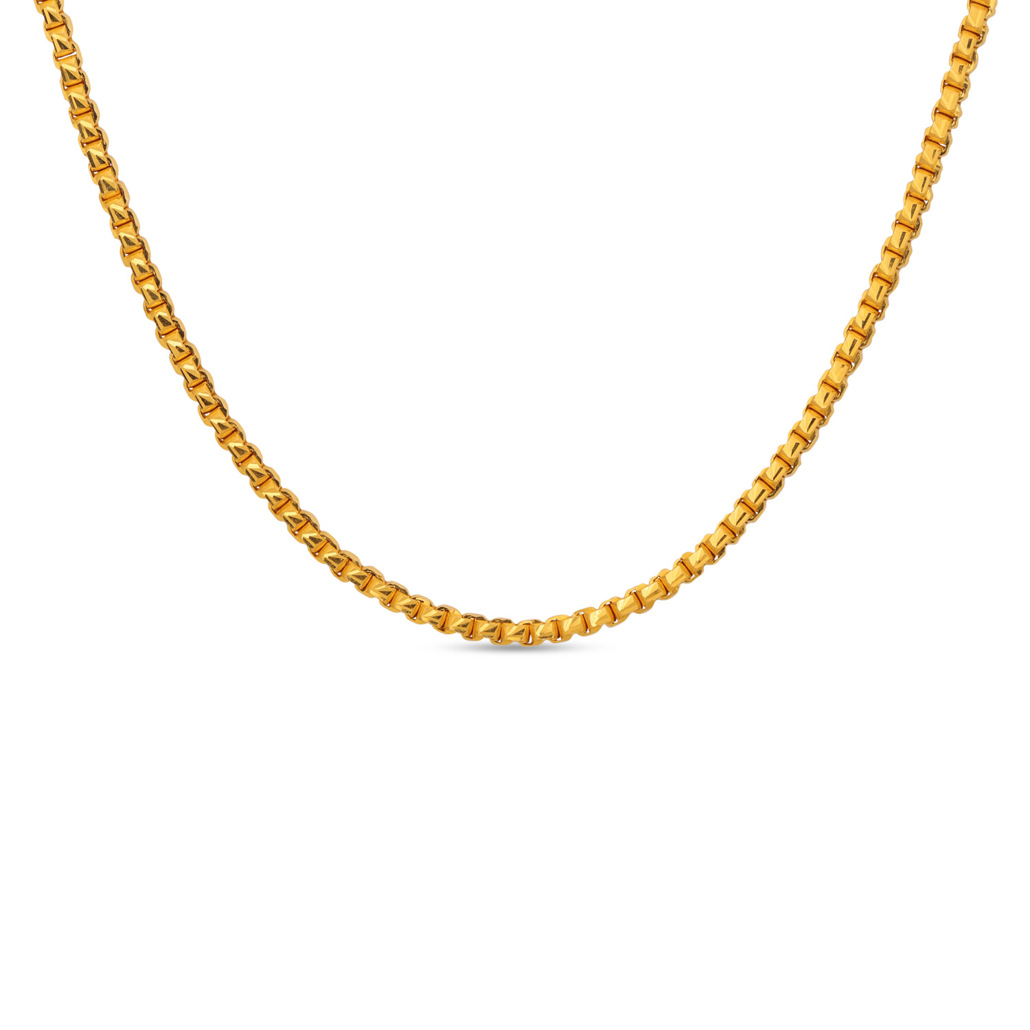 Appreciate structured beauty with this 22kt Gold Plain Box Design Chain. The interlocking box links provide exceptional strength and a distinctive, uniform pattern. A contemporary take on chain design that offers a perfect blend of modern style and timeless gold value.