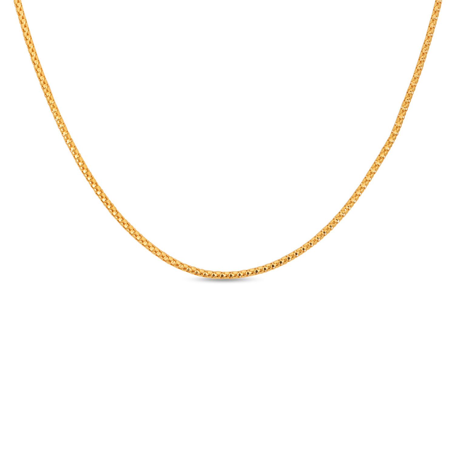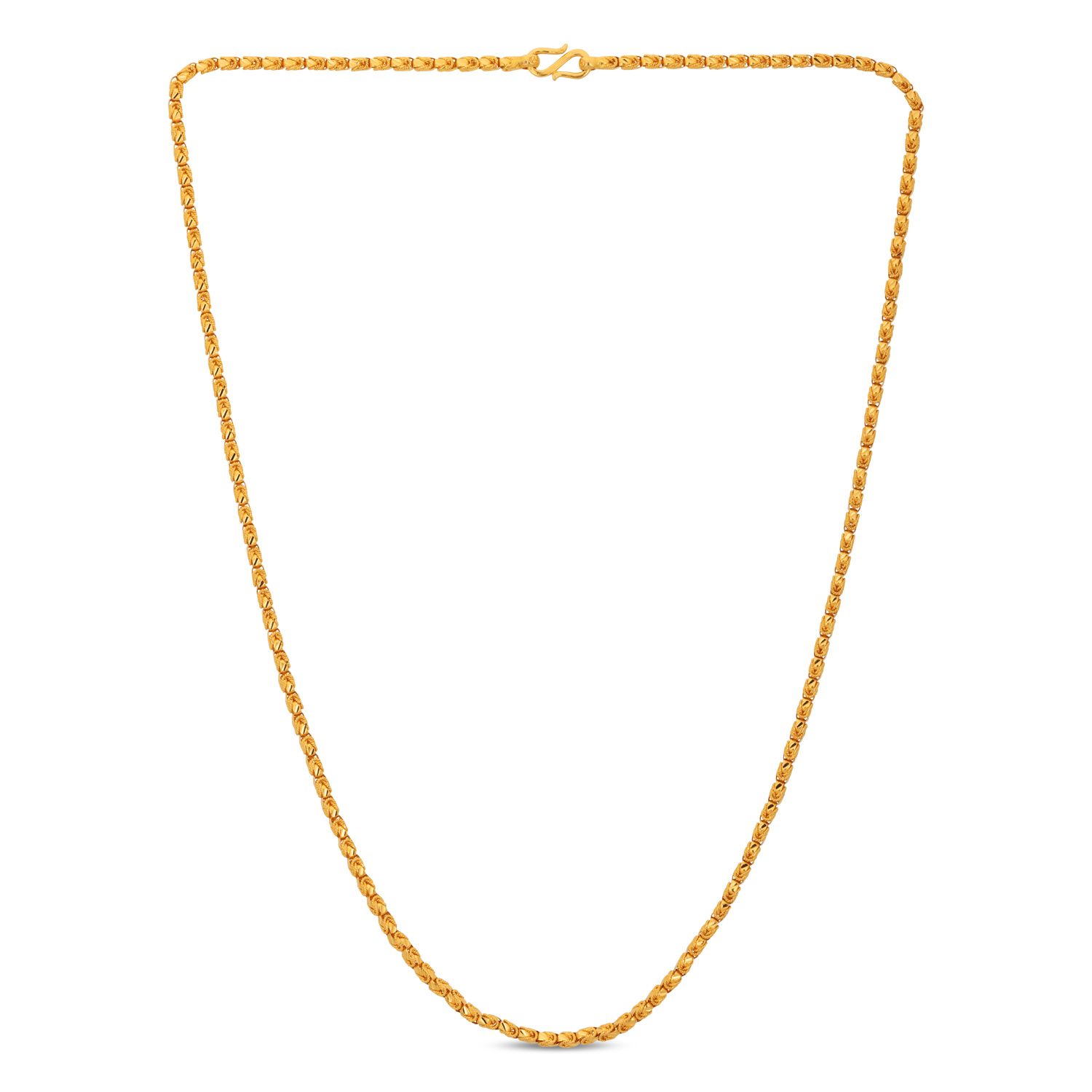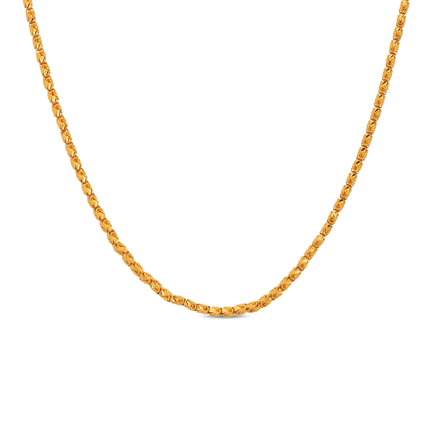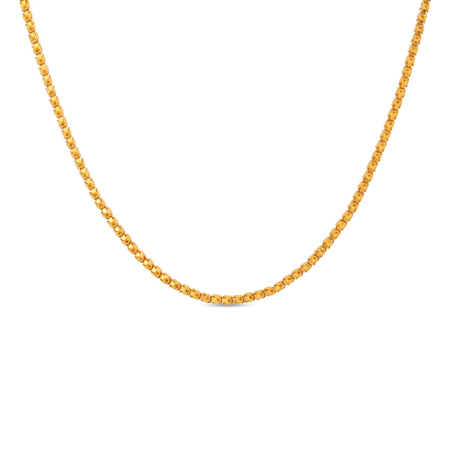 Appreciate structured beauty with this 22kt Gold Plain Box Design Chain. The interlocking box links provide exceptional strength and a distinctive, uniform pattern. A contemporary take on chain design that offers a perfect blend of modern style and timeless gold value.