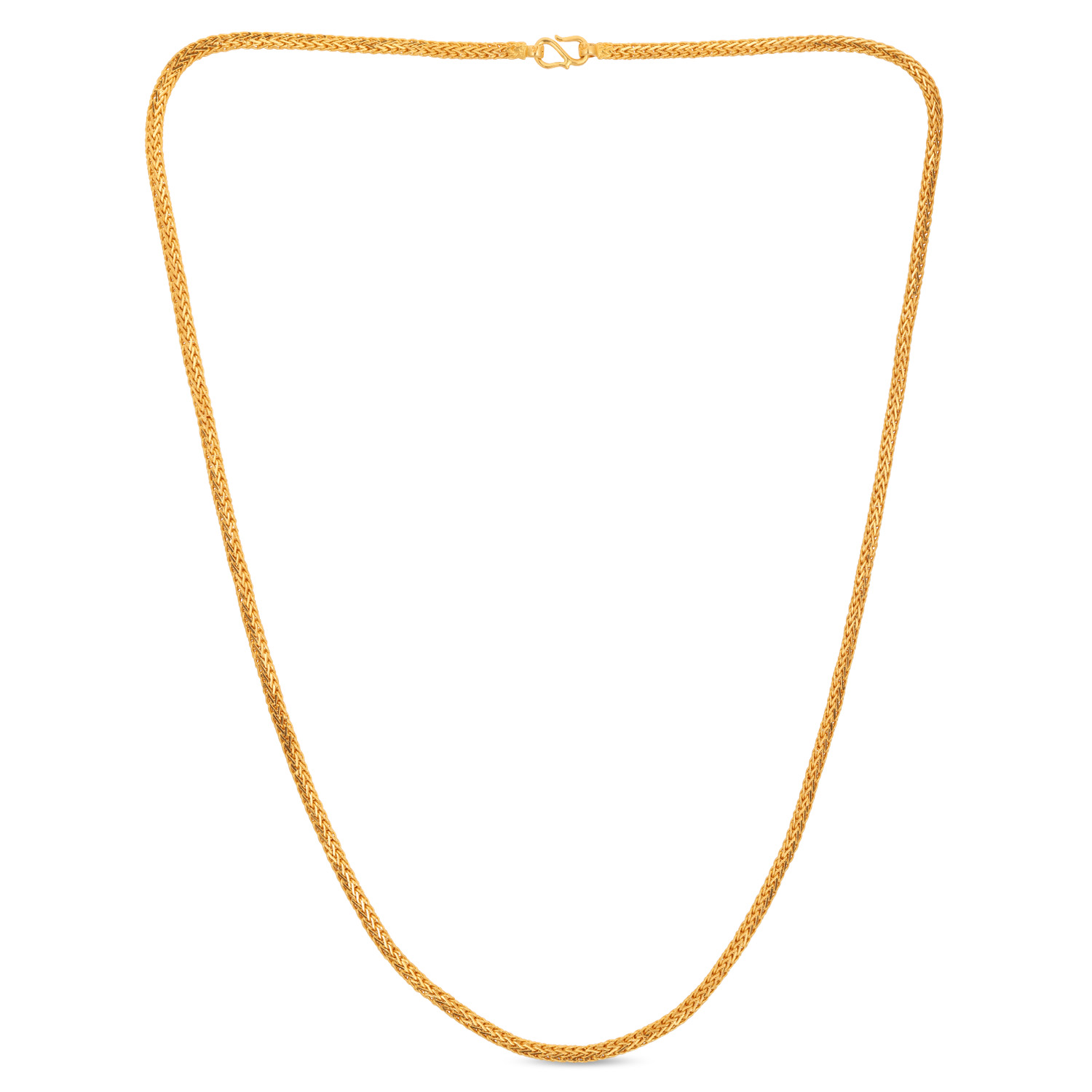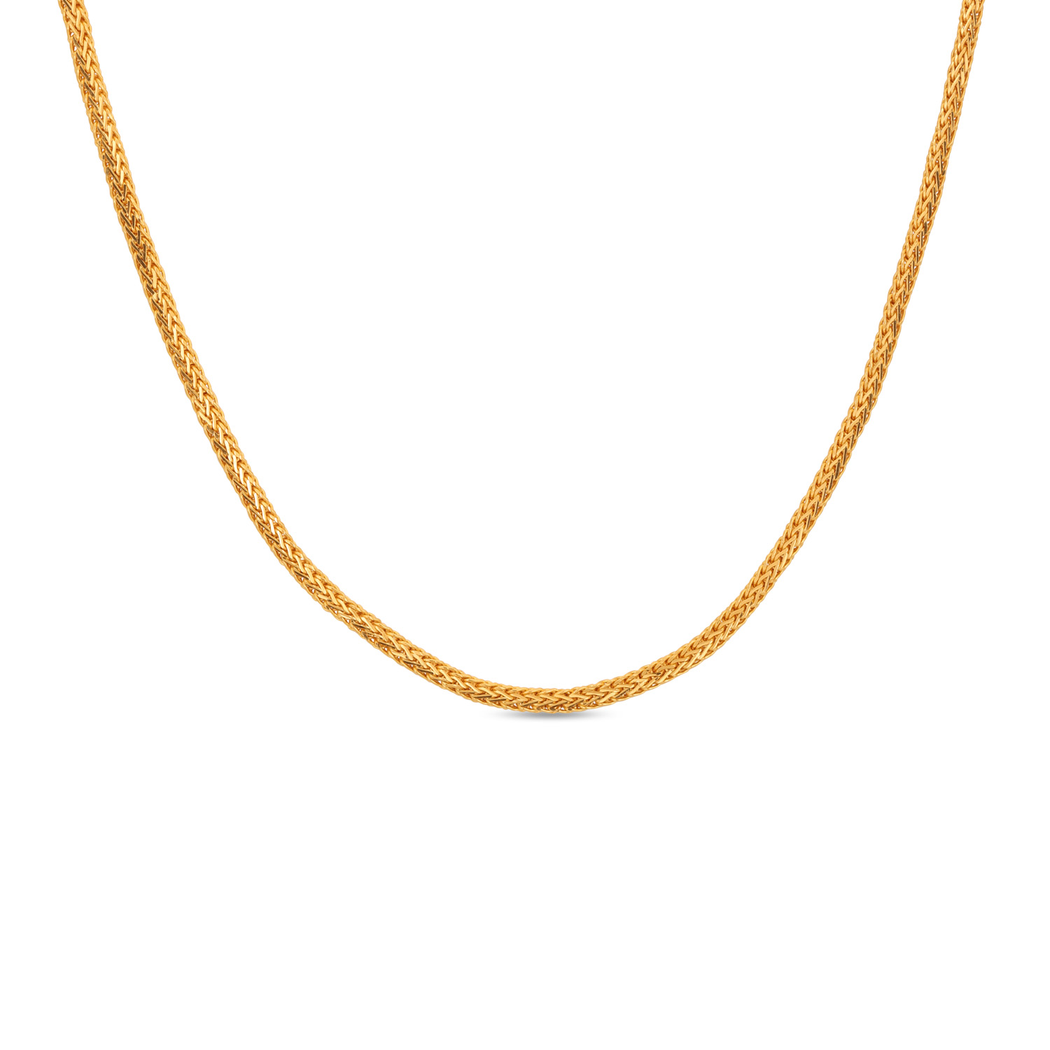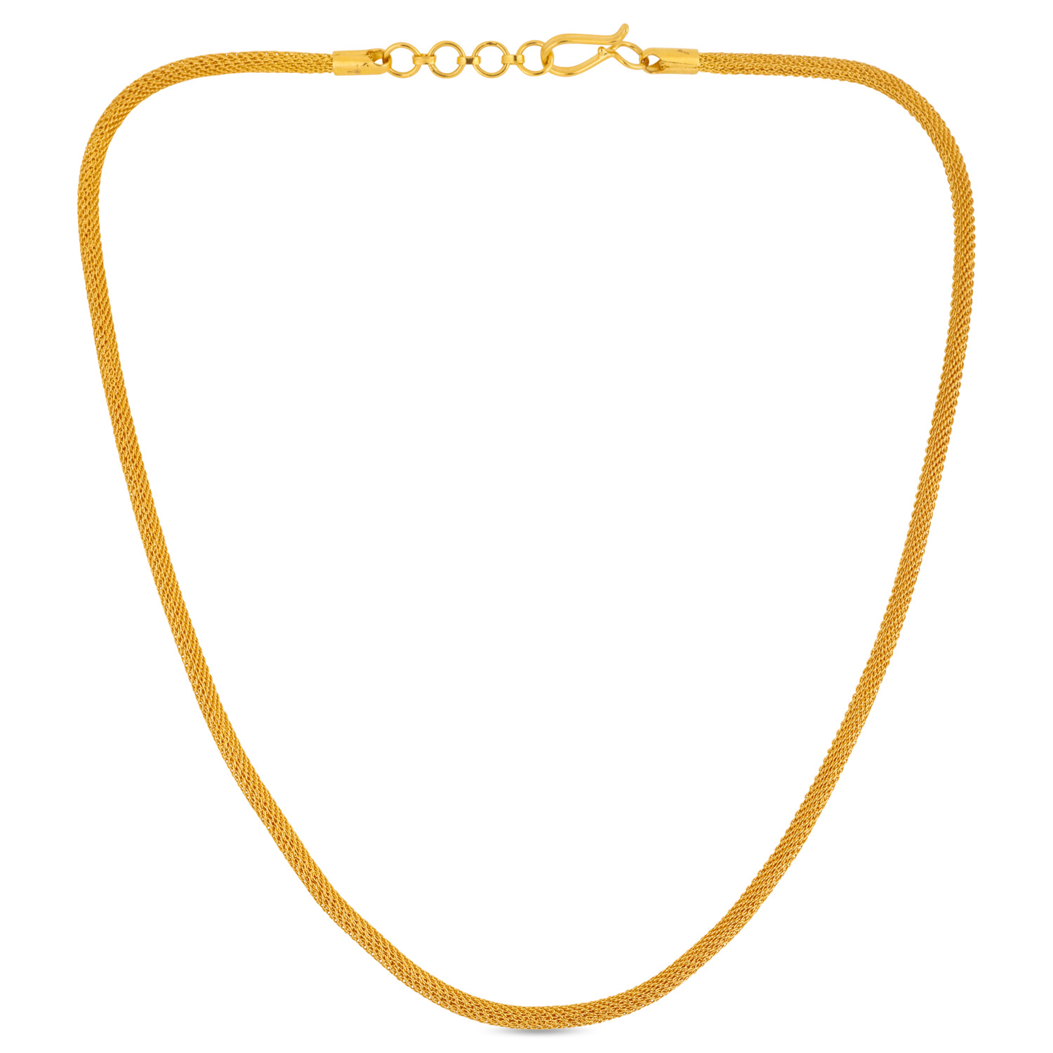 Experience delicate flexibility with this 22kt Gold Plain Mesh Chain. Woven from fine gold threads, it offers a soft, draping quality and a subtle, all-over sparkle. A feminine and elegant choice that is perfect for delicate necklines and layered looks.