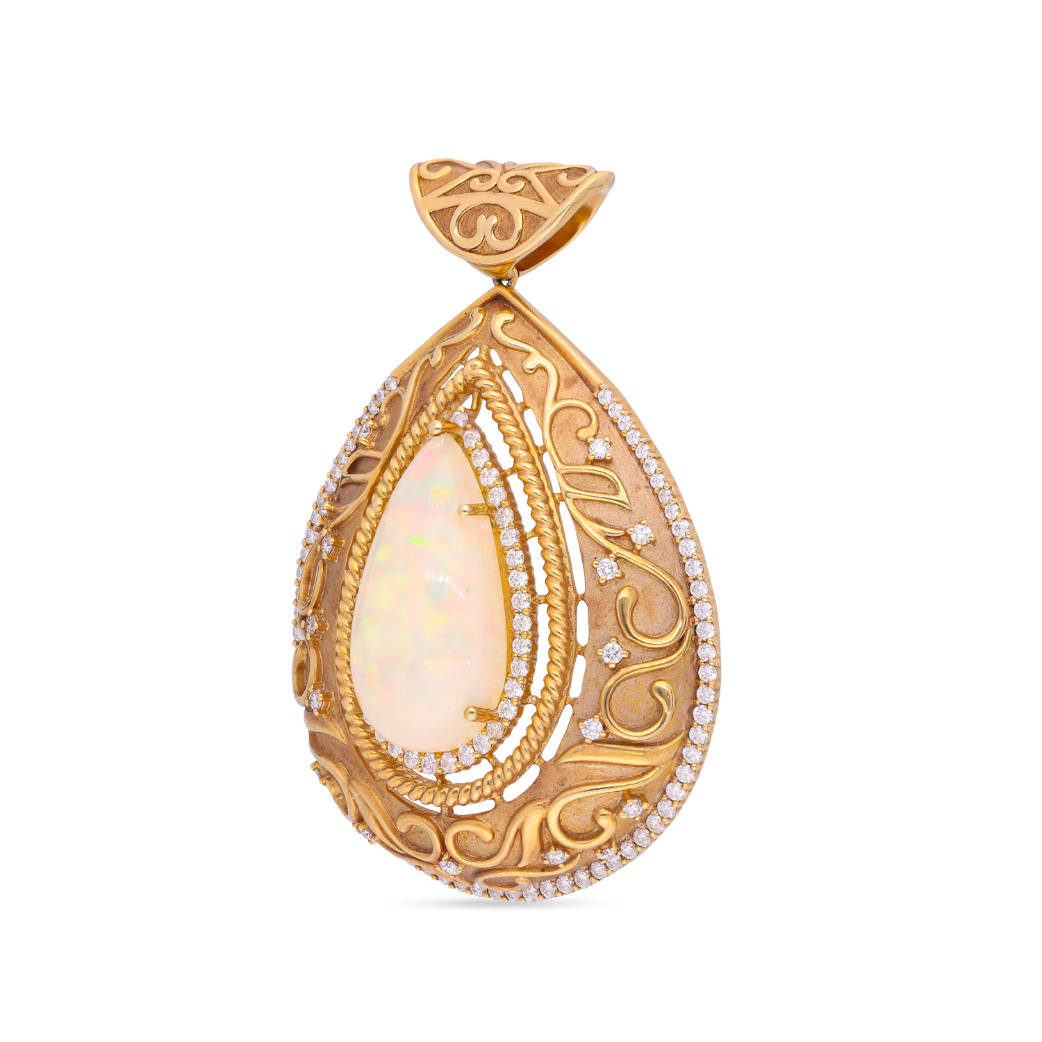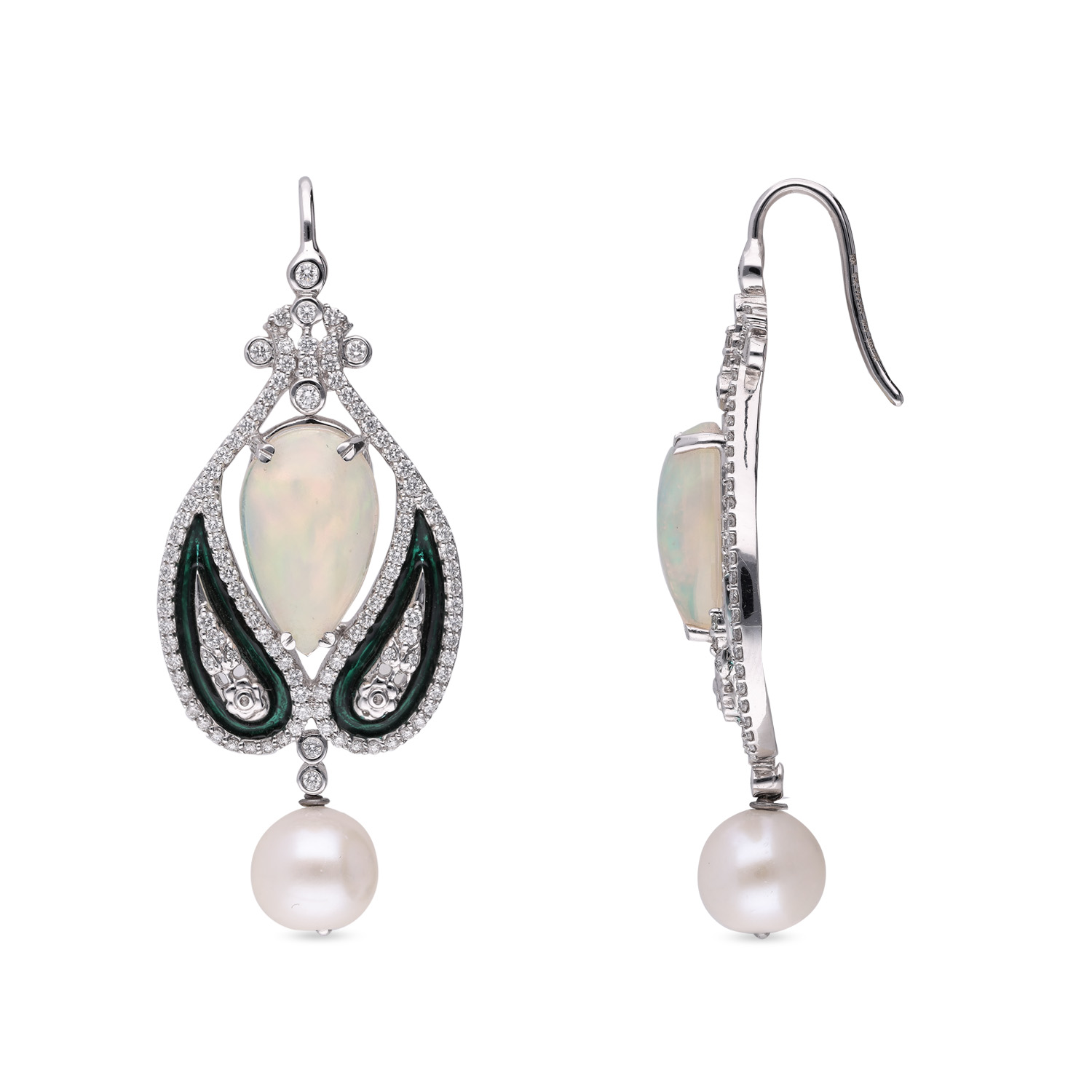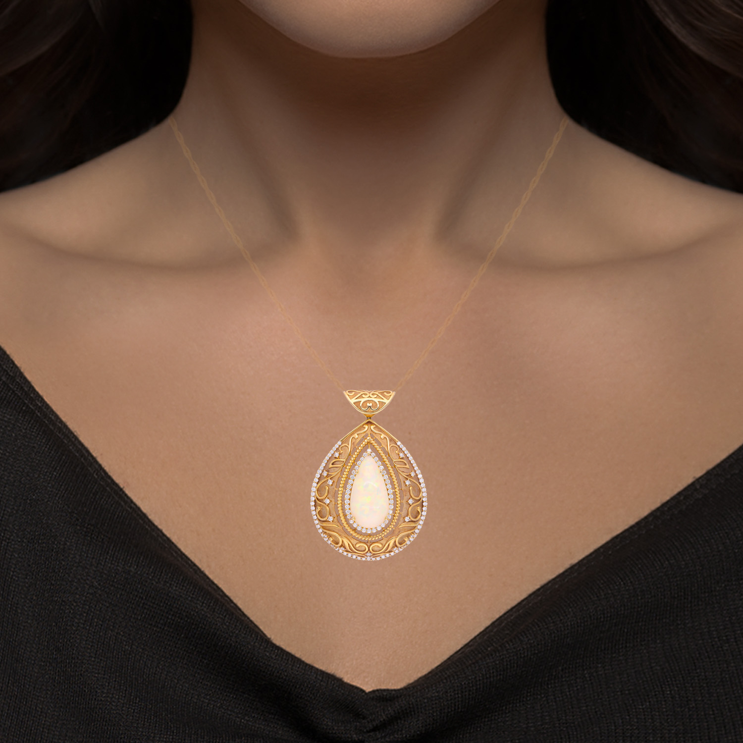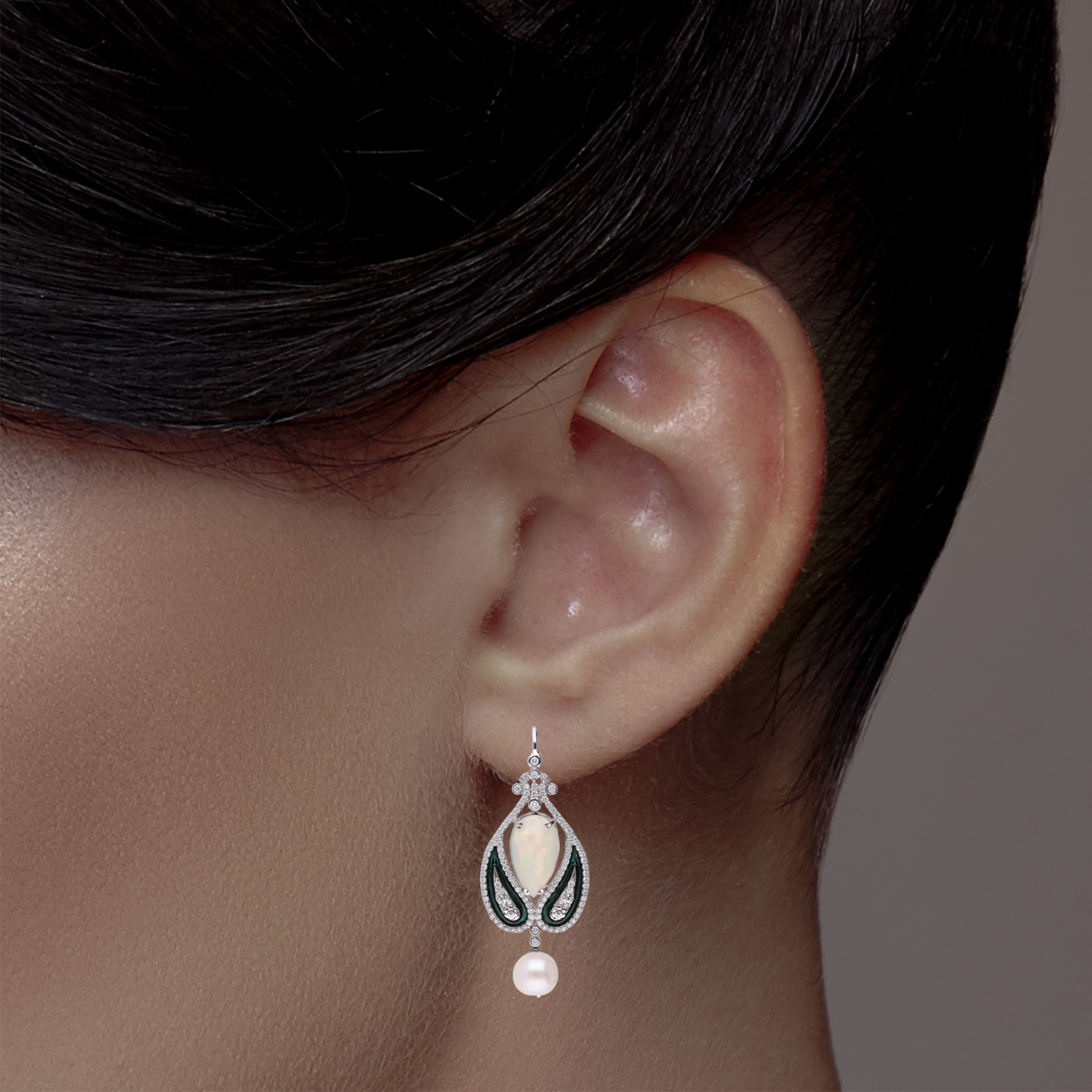 A luminous opal centerpiece embraced by sparkling diamonds, accented with a graceful pearl drop. A masterpiece of elegance, radiating timeless sophistication and allure.