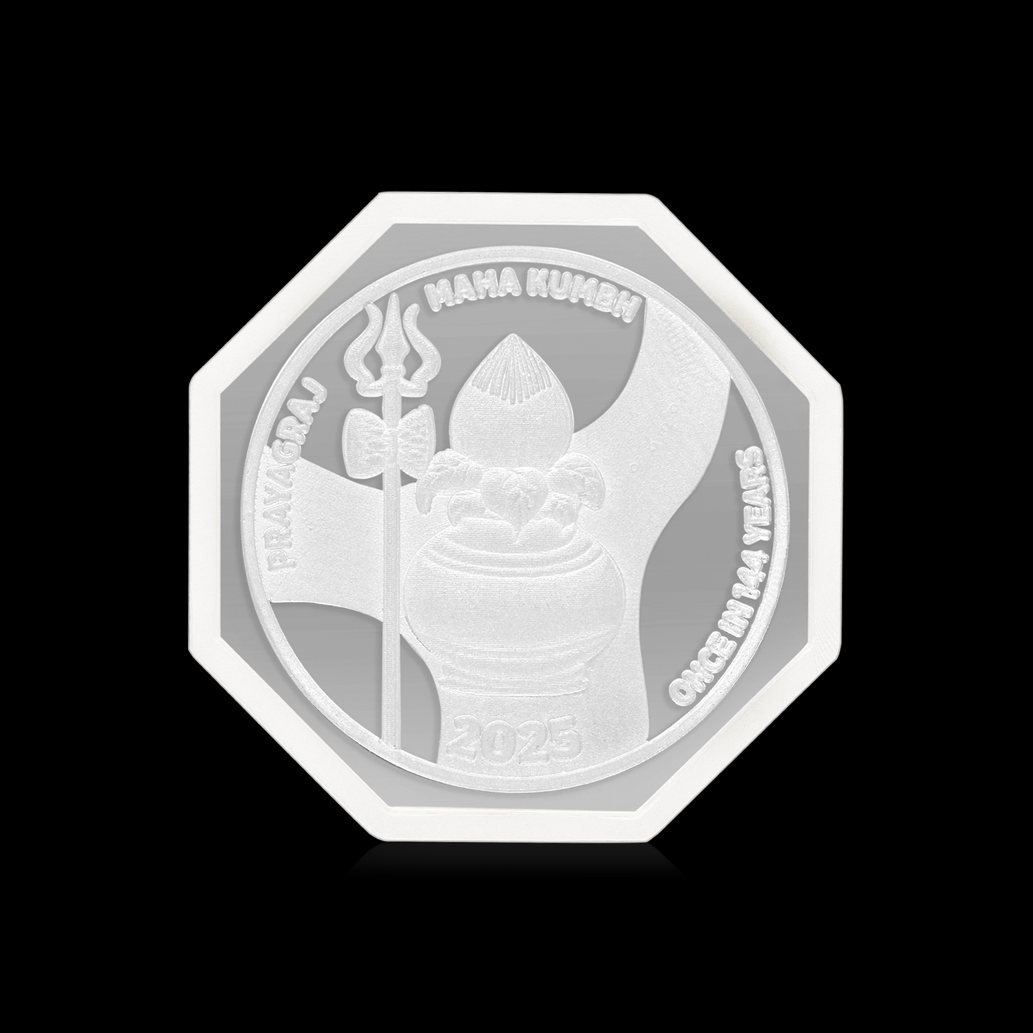 Celebrate the spiritual grandeur of the Mahakumbh 2025 with this exquisitely crafted pure silver coin. Minted in 999 fine silver, the coin features sacred motifs that honour the divine confluence at Prayagraj. A timeless keepsake of devotion, tradition, and auspicious beginnings.