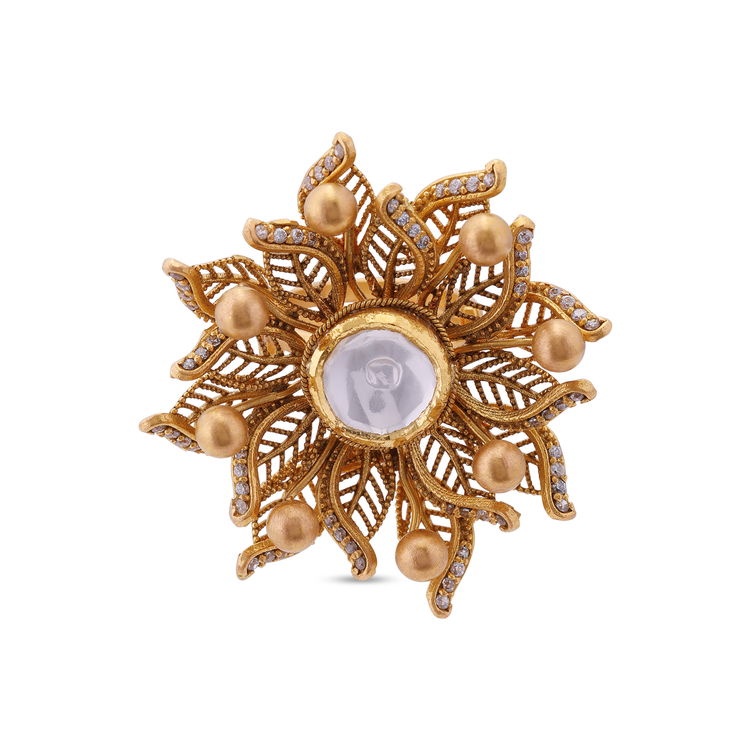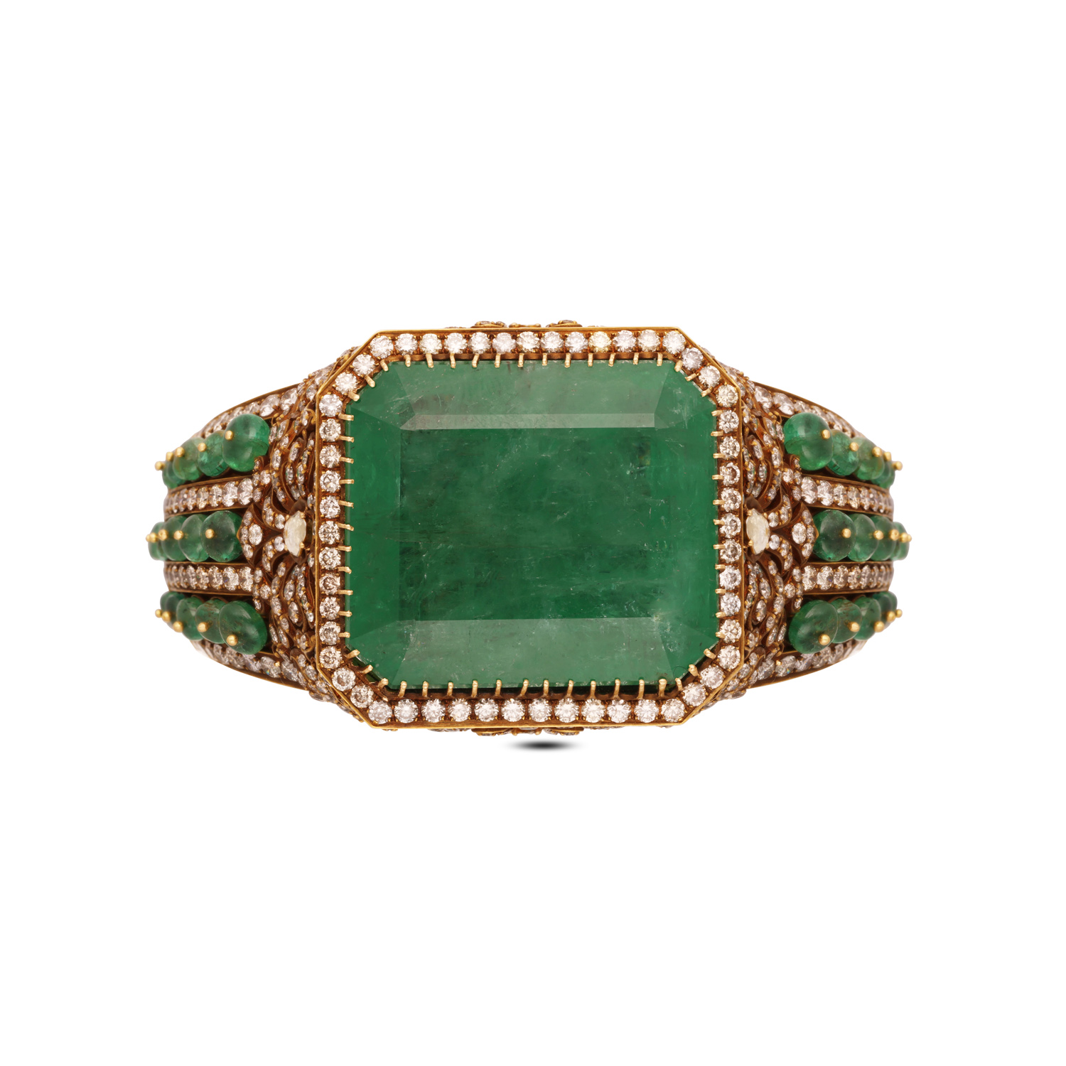 A magnificent antique-style gold ring featuring a grand emerald centrepiece framed with shimmering rose cut diamonds, exquisitely detailed with intricate filigree artistry that reflects regal heritage, timeless elegance, and masterful craftsmanship.